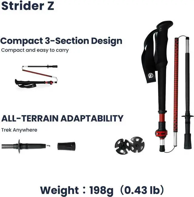 Versatile All-Terrain Tips Includes tungsten carbide tip, rubber caps, mud basket, and snow basket. Built to handle rocky paths, muddy trails, icy slopes, and snowy conditions year-round.