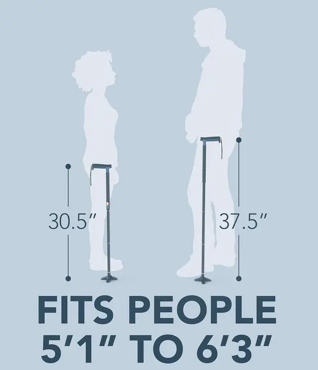 SIMPLE ADJUSTMENTS - No more pesky, painful push pins. The Quick Fold foldable cane is simple to adjust - simply press, slide, and set. Our walking canes are suitable for heights ranging between 5' 1" and 6' 3" - walking cane length 30.5" to 37.5".