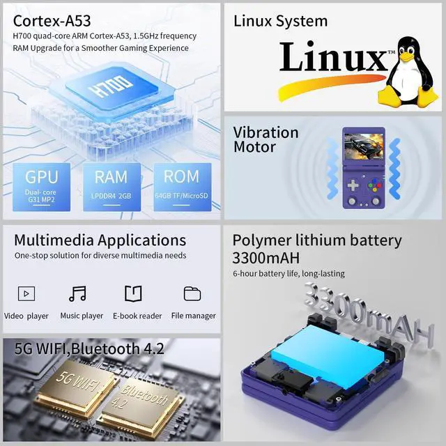 Multifunctional Flip Game ConsoleFlip Built-in 2.4 /5G WIFI 802.11 a/b/g/n/ac, Supports 2.4G wireless controller and wired controller connection, Bluetooth controller connection, H-D-M-I connection to TV, vibration motor, online multiplayer via WiFi, and streaming other functions. Supports video playerfile manager, and e-book reader (supports txt format).