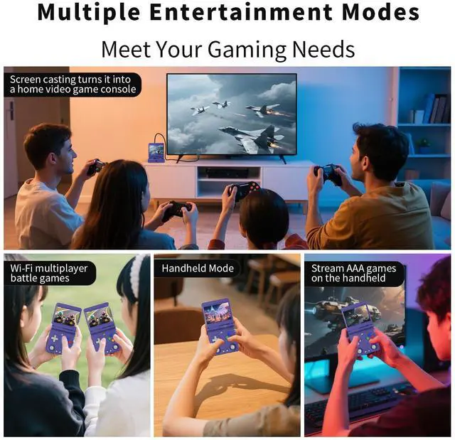 Flip Gaming Console Supports Multiple Entertainment Modes Flip Built-in 2.4 /5G WIFI Supports 2.4G wireless controller and wired controller connection, Bluetooth controller connection, H-D-M-I connection to TV, vibration motor, online multiplayer via WiFi, and streaming other functions. Supports video player.