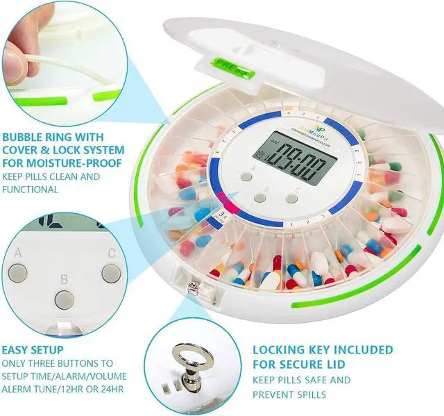 [EASY SET UP & EASY-READ LCD] Easy&Quick-Fill Removable Carousel Makes Loading Prescriptions, Vitamins & Pills a Breeze/ 3-Button Easy to Program Time/Alarms/Volume/Beep Tunes/12HR or 24HR / Interface Shows Large Letters & Super Bright Electronic LCD Display/ Digital Interface Displays Time, Then Beeps & Flashes When Prescription is Due/ Slide Drug Window to Open Door, Flip The Unit Upside Down & Take Meds to Stop Alarm.
