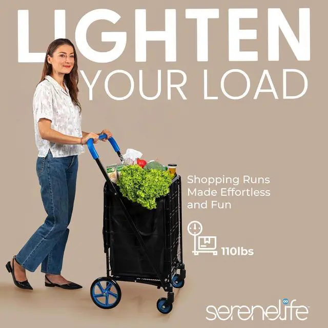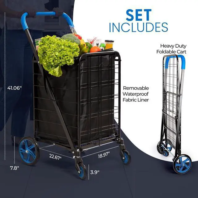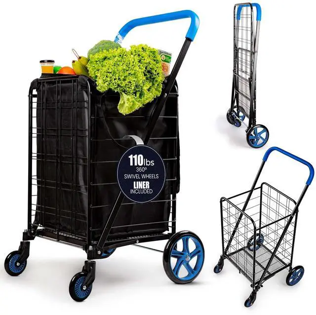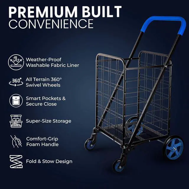 EXTRA CONVENIENT FEATURES - Quick and tools-free assembly gets you ready to roll in no time with our collapsible grocery cart. The detachable cart liner is easy to clean, and the stable low center of gravity design prevents tipping