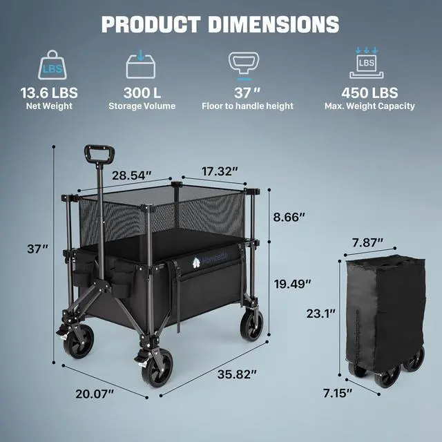 Quick Fold & Easy Storage Wagons Carts Foldable ble Decker Our ble deck wagon folds down to just 23.1"H × 7.15"L × 7.87"W, perfect for tight spaces; includes removable 600D Ox fabric lid for tear-proof, waterproof, easy cleaning after beach or camping trips.