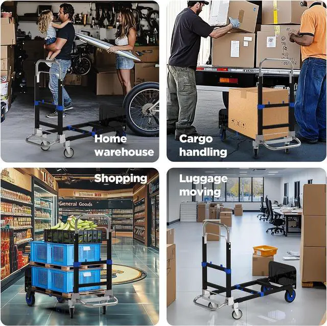 All-In-One DesignThe collapsible dolly with wheels has two modes of use. The collapsible dolly with wheels can be quickly converted from 2-wheel hand truck to 4-wheel horizontal cart mode. Easy to conversion without any tools and pins. The collapsible dolly with wheels' ergonomic all-in-one design makes it ideal for home or work.