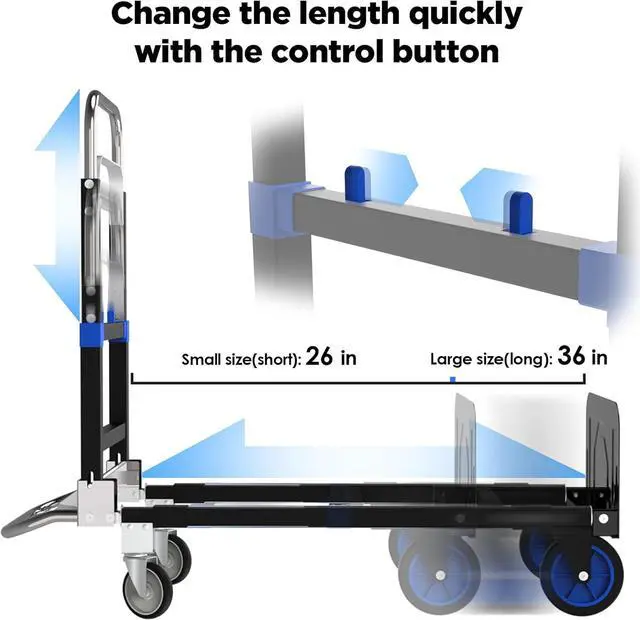 EXPANDABLE BASE&ADJUSTABLE HANDLEThis hand truck dolly foldable features an expandable loading base surface that can accommodate larger sized items. The adjustable telescopic handle can be adjusted up to 38 inches which can be adjusted according to your needs. This hand truck dolly's