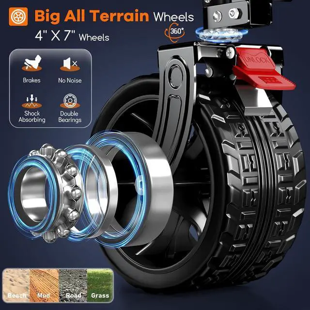 -, This beach carts features 4 larger and wider 7"x4" ble bearings all-terrain big wheels, allowing for flexible steering and smooth rolling on various road surfaces such as mud, grass, and hard sand. The two 360° rotation front wheels with brakes, effectively to stop and prevent the wagon from moving. It' s shock-absorption and noise-reduction, ensuring durability and resistance to wear and tear.