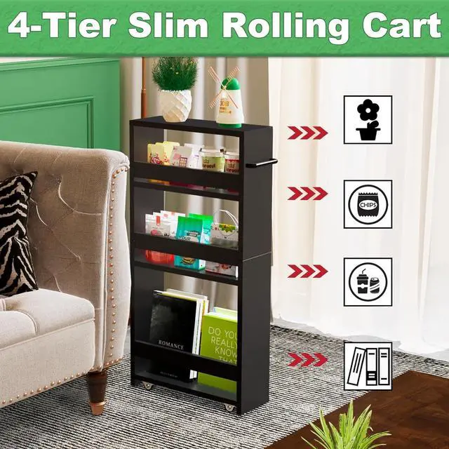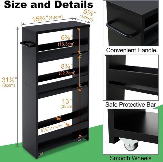 Large Storage CapacityThis 4-tier storage trolley has 3 open shelves and one top board to provide enough space to store all of your essentials. It is ergonomically designed to store items of different heights.