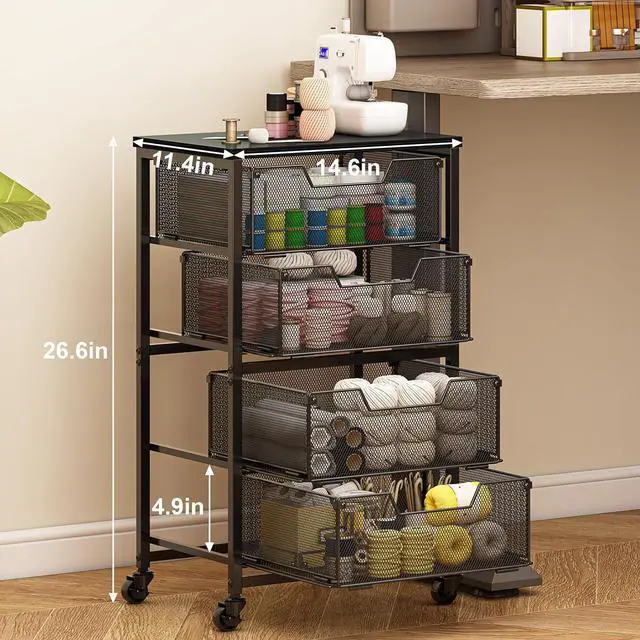 Compact but Spacious StorageOverall dimensions: 14.6"W x 11.4"D x 26.6"H. Each storage drawer measures 12" x 16.5" x 4.25", offering ample space without taking up much room. A versatile storage cart for the craft room, kitchen, office, or bedroom