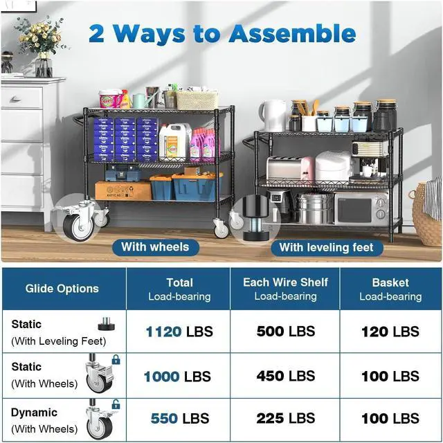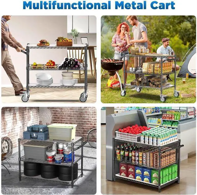 wheels: 360-degree flexible rotation, easy transportation and labor-saving. Simple 3 tier wire storage cart structure, all parts are in the package, no tools required to assemble.