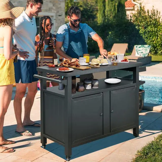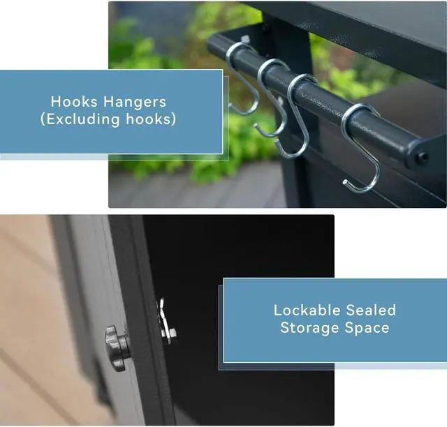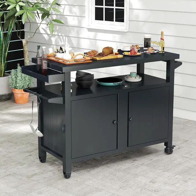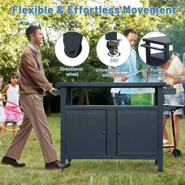 Versatile design - two sides of grill cart can place paper towel, hook holder, condiments, drinks or barbecue tools, allowing you take them easily during the barbecue. On below of the outdoor grill cart with a cabinet to store your kitchen tools, food, or snacks. Outdoor grill carts with 4 wheels for effortless movement. You can lock the cabinet doors to prevent pests