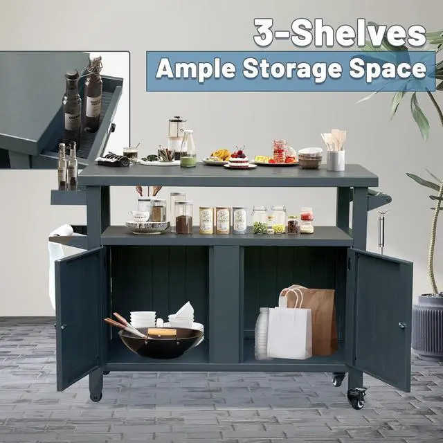 Ample Storage Space - the outdoor grill prep cabinet table is designed with three-tie of the griddle stand which provide plenty of storage space. The open storage area offers 26 gallons, perfect for storing grilling tools and accessories. The enclosed cabinet provides 57 gallons of storage capacity, allowing for even more room for miscellaneous items