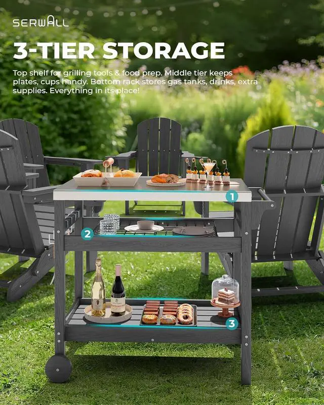 Durable and Weather-Resistant: Crafted from metal and high-quality HDPE, this Outdoor BBQ Grill Cart resists rust, pe, and weather damage. It withstands various climates, ensuring long-lasting use in your garden or patio.