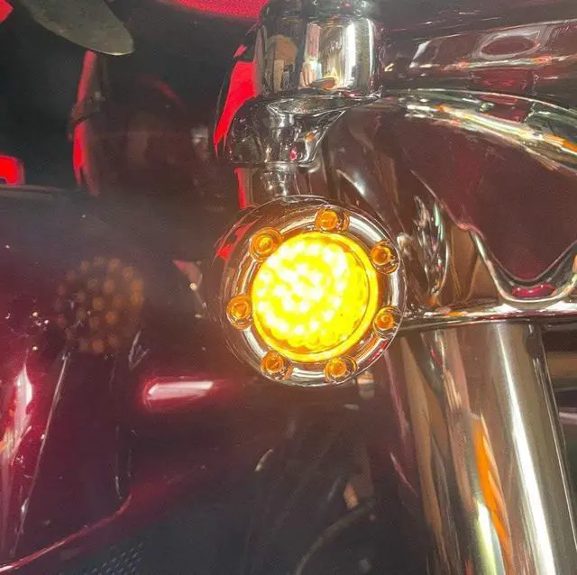 NEVER GO DARK Brand new design. Our Harley front LED turn signals have a 7 LED halo ring mounted inside an integrated trim ring. The halo ring is 6000K and is a pure bright white light. It will match all of your other LED products. The inner 24 LEDs are amber and function as the turn signal. The halo ring will turn off when the LED turn signal is active.