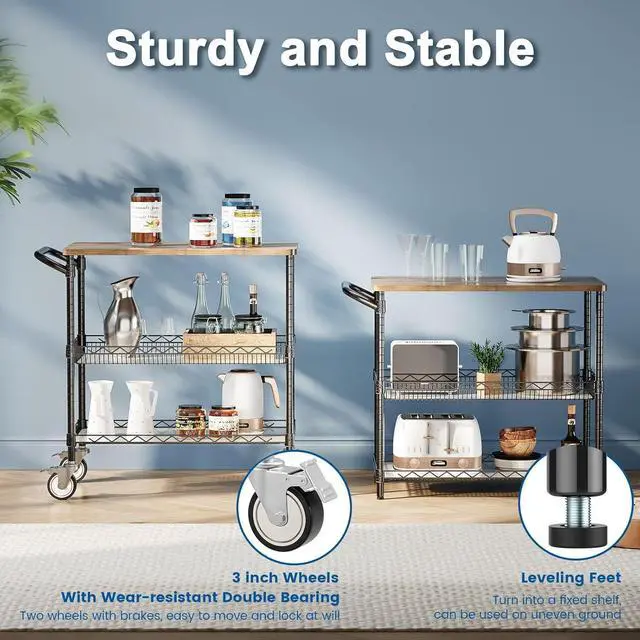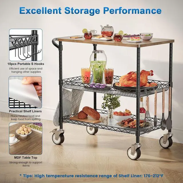Shelf Liners: Packaged with 5pcs S metal hooks (3cm), each hook can bear 22 pounds and hang kitchen supplies or other daily necessities. 2 extra PP shelf liners are included, and you can place heated food and prevent food from spilling and convenient for you to clean this 3 tier utility cart.