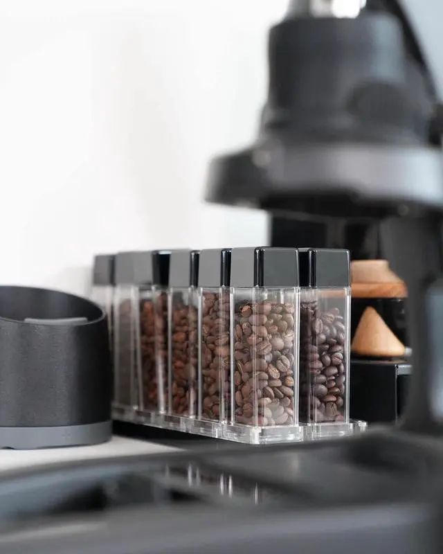 CONVENIENT STAND & HOPPER - The stand is made from sturdy acrylic, able to store your beans in an organized way, and yet pleasant for your countertop. The set includes a mini-hopper for easy re-filling. Also suitable to carry for camping or on the go.