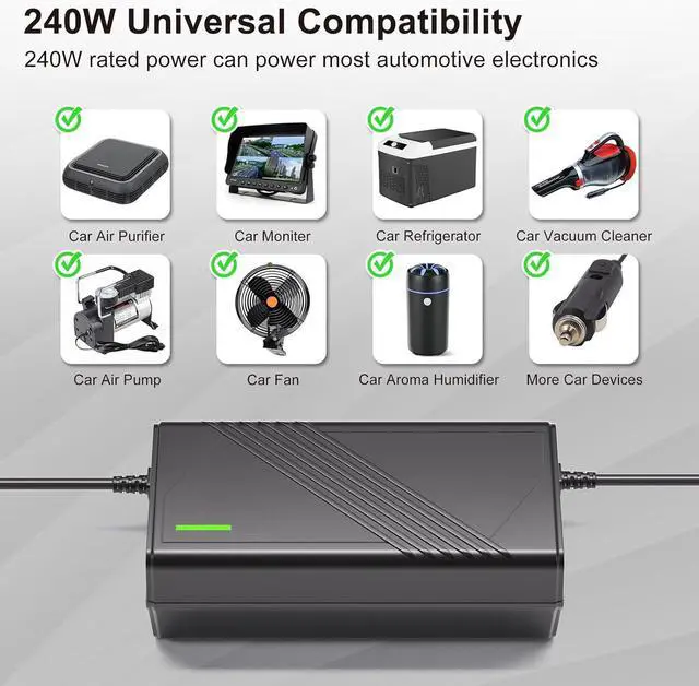Important Note: For l performance and device protection, please ensure your connected 12V device's continuous rated power is below 240W. It is normal for the power converter to generate heat when running for a long time or using high-power equipment. If there is deformation or melting, please stop using it immediately