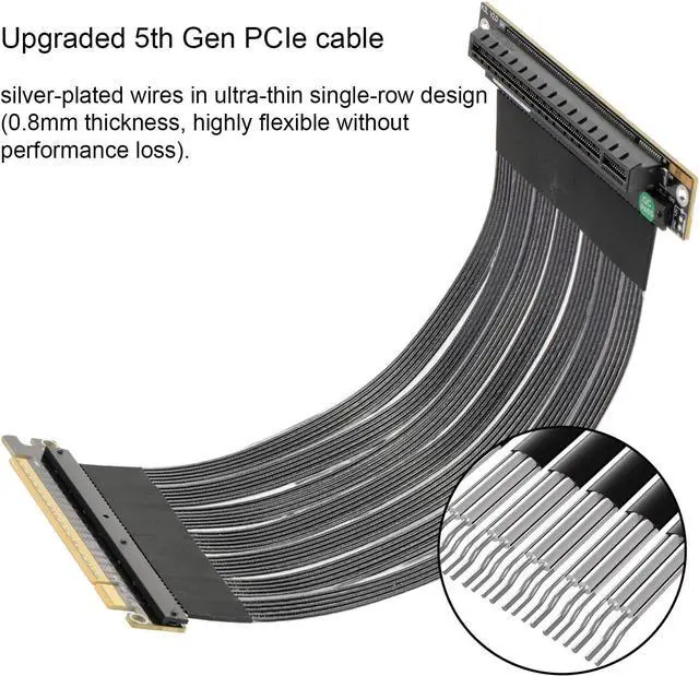 d gold-plated connectors with thickened gold fingers ensure stable signal transmission and durability for frequent plugging/unplugging. Upgraded 5th Gen PCIe cable with silver-plated wires in ultra-thin single-row design ( 0.8 mm thickness, highly flexible without performance loss).