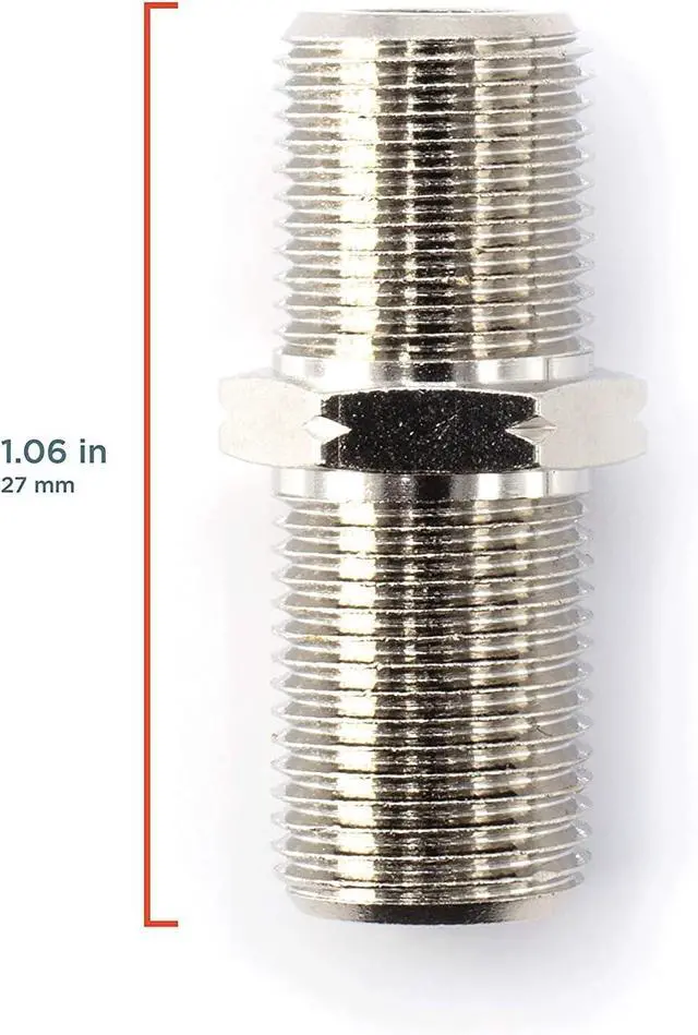 Manufactured From: High quality, weather resistant material with extremely low signal attenuation This cable extension adapter connects two coaxial video cables for TV's, DVD's, DVR's, VCR players and more (including compatible modems, antennas and other analog setups). Featuring easy to screw in F-pin connections, this coupler is designed for indoor and outdoor use, seamlessly connecting, joining and extending the length of RG58, RG59, RG6, and RG11 coax cables. By providing a reliable and durable signal transfer, our 3GHz rated coax couplers offer high quality, weather resistant connectors with low signal attenuation and support for both, audio & video use. Also installs easily to most wallplates. Effectively handles signals for major cable television, satellite tv and internet providers, including: Comcast (Xfinity) Verizon Charter Cable DIRECTV (Now AT&T) Satellite Dish and More Technical