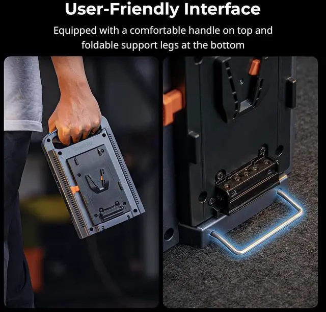 Portable Design: Designed for convenience, dual channel V mount battery charger features a comfortable handle on top and a foldable bottom stand, allowing for easy portability and hassle-free use. Whether you're on location or in the studio, you can take this charger with you wherever you go, ensuring your batteries are always ready for action.