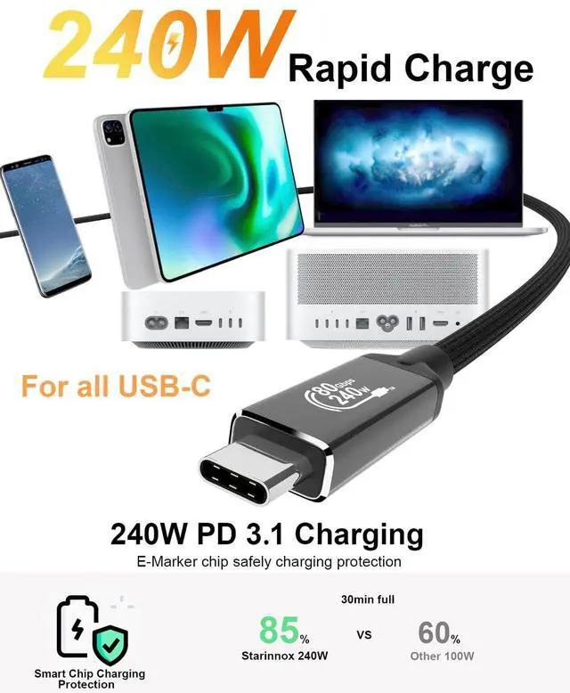 [240W PD 3.1 ] Equipped with a remarkable 48V/5A power delivery rating, this Thunderbolt 5 cable supports up to 240W of power delivery, facilitating rapid charging for compatible devices.