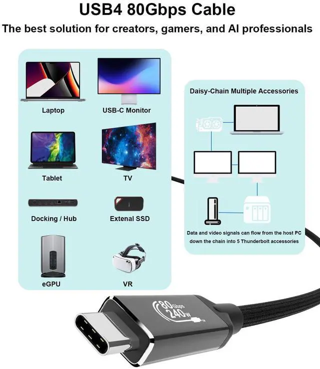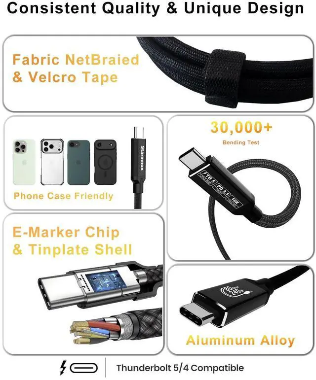 [Full Feature Application] Fully compatible with Thunderbolt 5/4, Thunderbolt 3, USB4, and USB 3.2. Its ample length adapts to various scrios, making it the ideal companion for MacBook M4 Pro/Max, Razer Blade, ACASIS SSD, iPhone 17, iPad, USB-C monitors, docking stations, GaN chargers, eGPUs, and more.