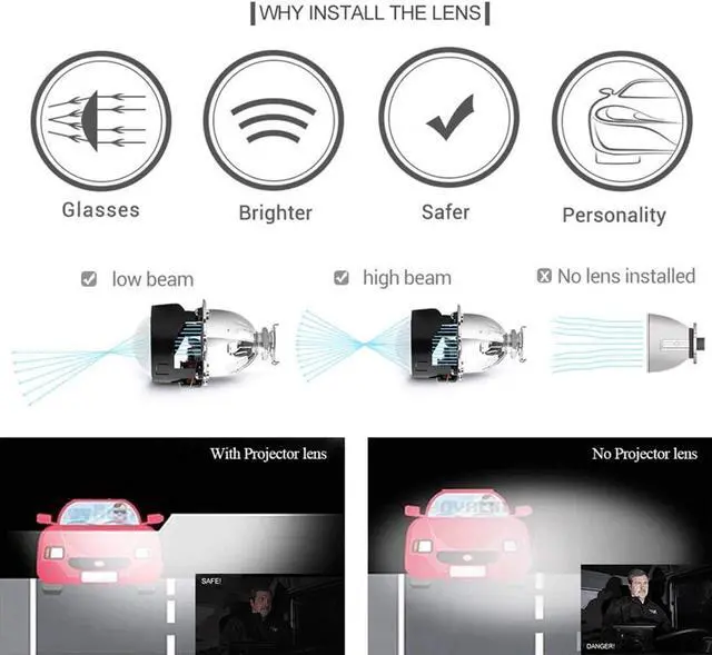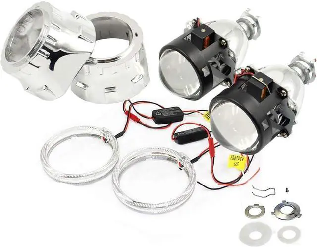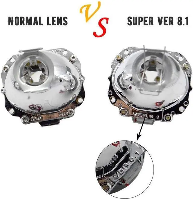 Packing Includes 2 x 2.5 Inch 8.1 VERSION Bi-xenon projector lens 2 x 2.5 inch high quality projector lens with shroud mask H4 and H7 Sokcet rings Installation fasteners
