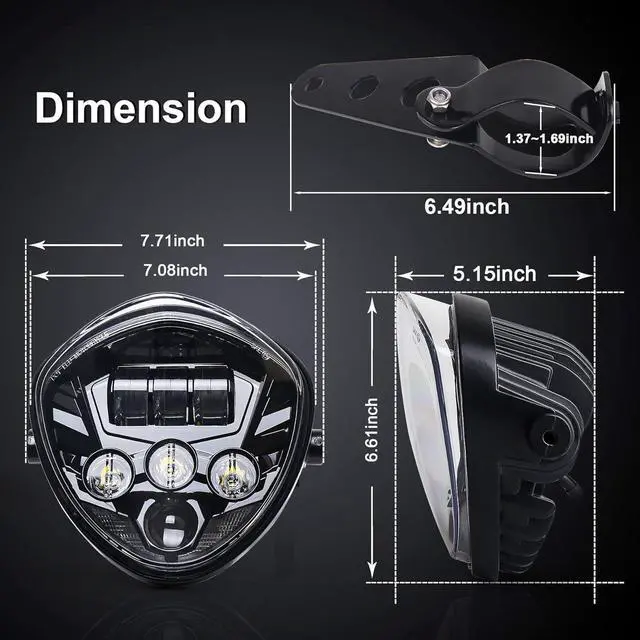 Voltage: 12v, super brightness Leds, improving light projection distance and overall visibility. This universal motorcycle headlight is aluminum housing ribbed design for efficient cooling, PC lens prevent moisture entering the headlight. Waterproof IP67, made longer lifespan, could work normally in any harsh condition.