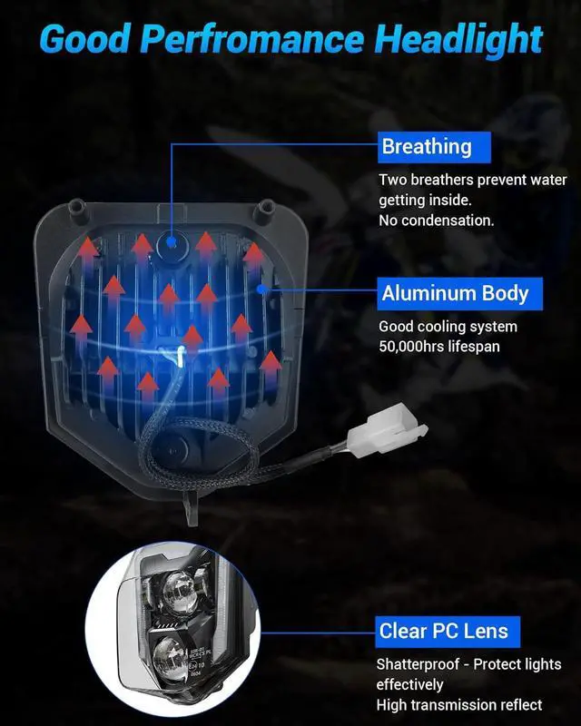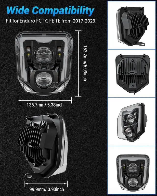 Fast Heat Condensation: This headlight for TE300i uses an aluminum body as a heat sink, having a good cooling system, moisture will disappear in a short time, and the lifespan of this enduro led headlight extends more than 50, 000 hours.