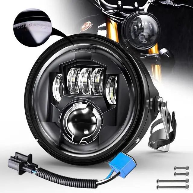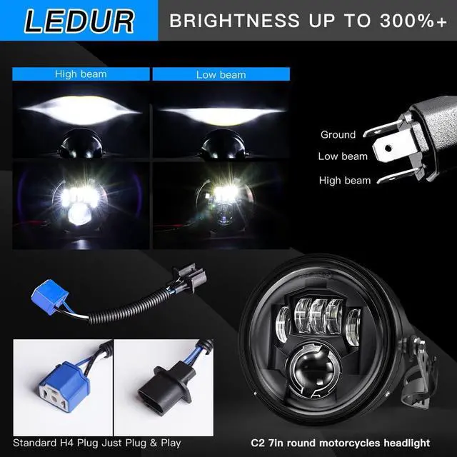 [EASY MOUNT & WIRING] Round 7 Inch LED Motorcycle Headlight Had pre-housing into the high quality stainless steel bucket(about 18.9" dimension). the 7" led motorcycle headlight complete kit Comes with Fork Clamp Mounting Bracketsfit for the motorcycle with 1.37 - 1.69 inch O. D Fork Tubes, Without drilling required. C2 Led Motorycle Headlight Carried Standard H4 Plug, plug & play to any 5.75" /7" motorcycle headlamp with standard h4 socket, if reverse polarity, h4 to 3-pin adapter will solve.