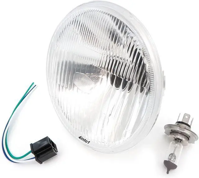 7" H4 Halogen motorcycle headlight. Fits most American and Japanese motorcycles with 7" headlights. Comes with standard 3 prong connector with wires. 7" headlights fit many of the 70's and 80's Honda CB's and other Japanese motorcycles.