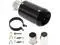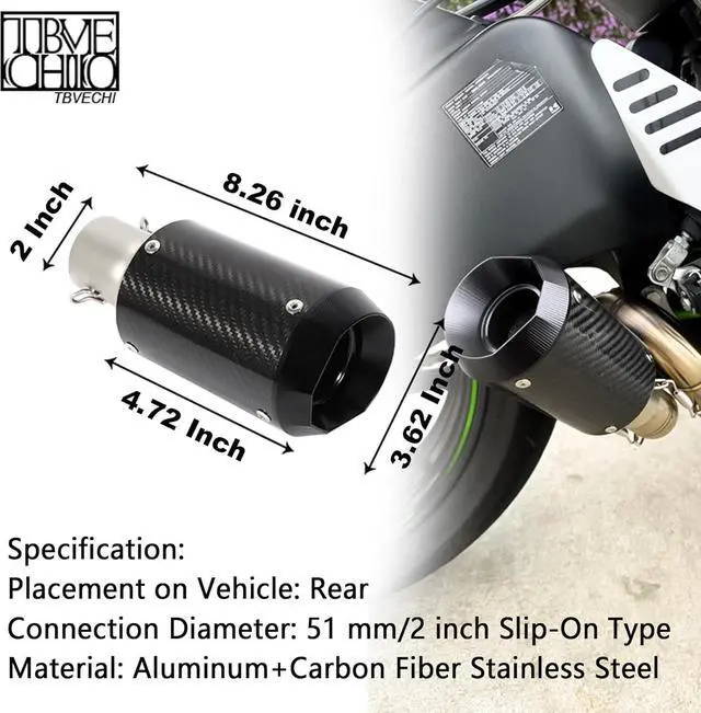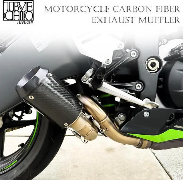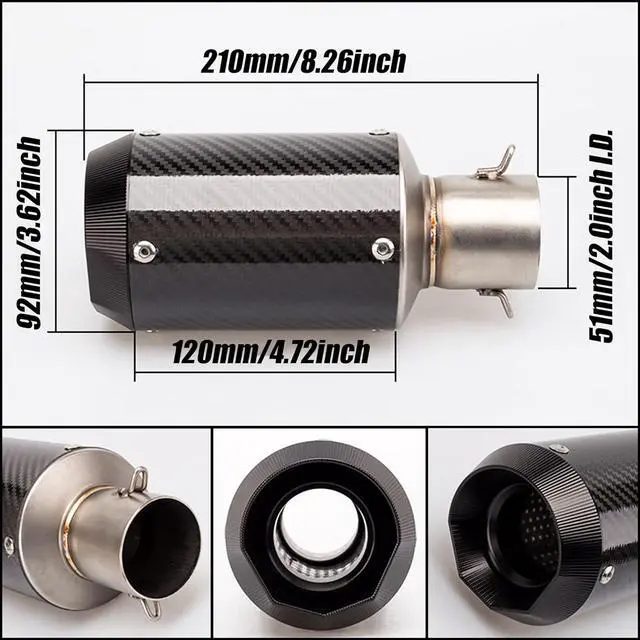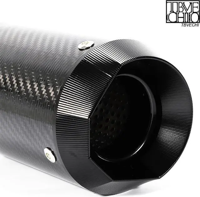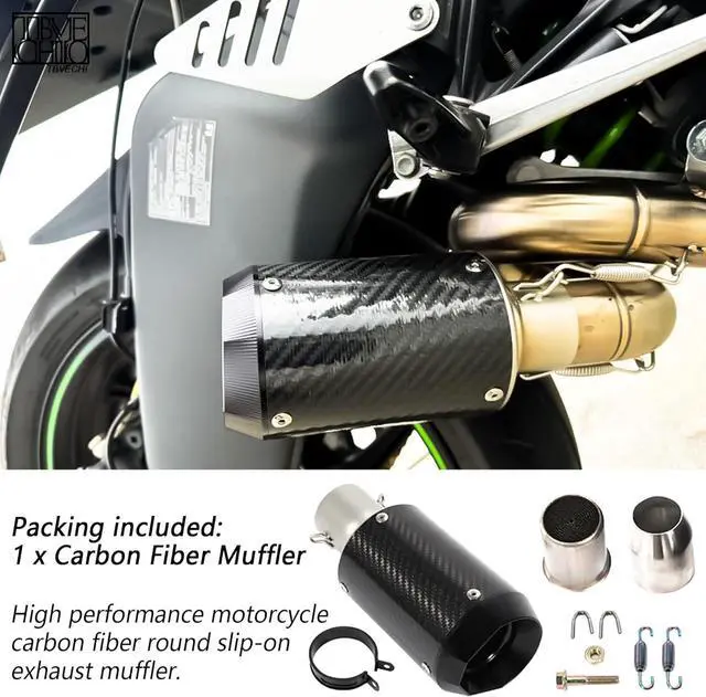 High performance motorcycle carbon fiber round slip-on exhaust muffler. CNC-machined billet aluminum inlet joint and outlet cap.