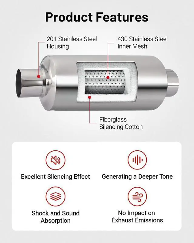 Effect: Straight-through exhaust muffler is densely covered with fiberglass to absorb sound and giving a low, deep tone; ble-layer stainless steel design helps reduce vibration and absorb sound