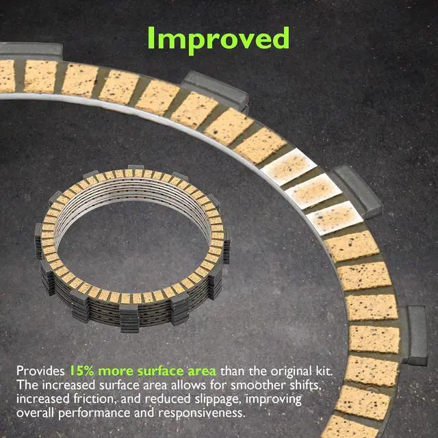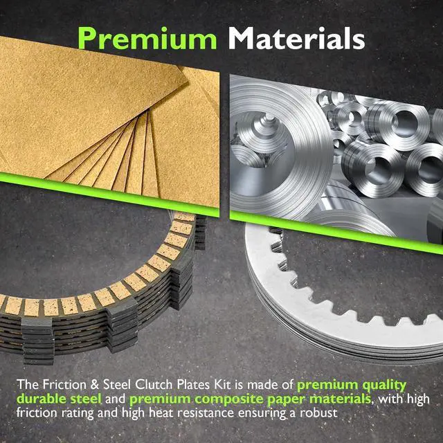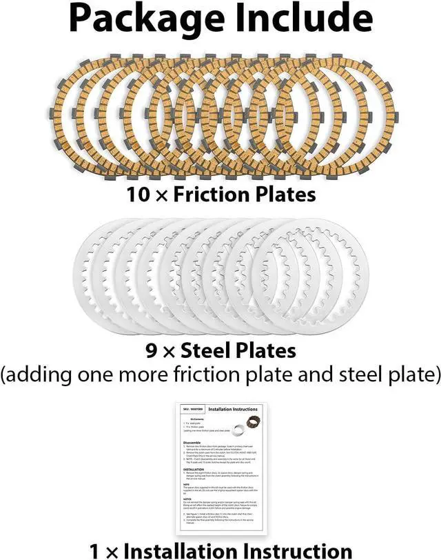 Performance: This Friction Steel Clutch Plates Kit is designed with 10 friction plates and 9 steel plates (adding one more friction plate and steel plate), and provides 15% more surface area. This increased surface area allows for smoother shifts, Increased friction, and reduced slippage, improving overall performance and responsiveness.