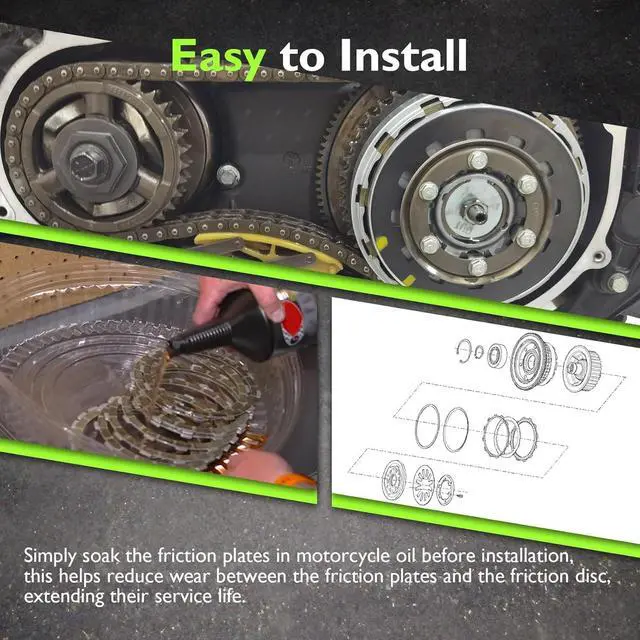 Easy To Install: This plate kit comes with instructions for easy installation. Simply soak the friction plates in motorcycle oil before installation, the oil will penetrate into the friction plates. This helps reduce wear between the friction plates and the friction disc, extending their service life.