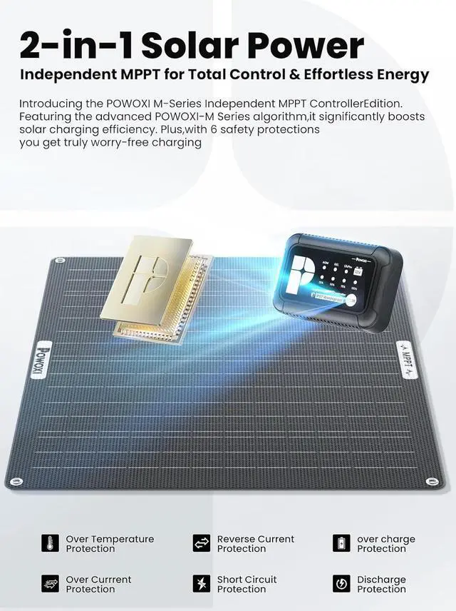 Stronger & More Long-lasting: Experience effortless energy with the M-Series Independent MPPT Controller Edition. Its 2-in-1 design and advanced -M Series algorithm significantly boost solar charging efficiency. Enjoy worry-free charging with more comprehensive safety protections: over-charge, over-discharge, over-voltage, over-current, over-load, short circuit, polarity inversion, and over-temperature, all within a waterproof and spark-proof build that fully protects your battery
