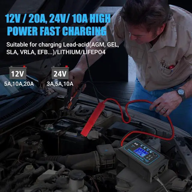 Application: 12V 20A/24V 10A battery charger for Lead-Acid(AGM, Calcium, GEL, MF, EFB, SLA, VRLA, WET), Lithium and LiFePO4 battery, please do not charge other types of battery! It is widely used to provide safe and efficient charging for car, motorcycle, boat, lawn mower, etc. Automatically identify the defective battery so that you can replace it in time. It can recognize 12V/24V battery automatically.