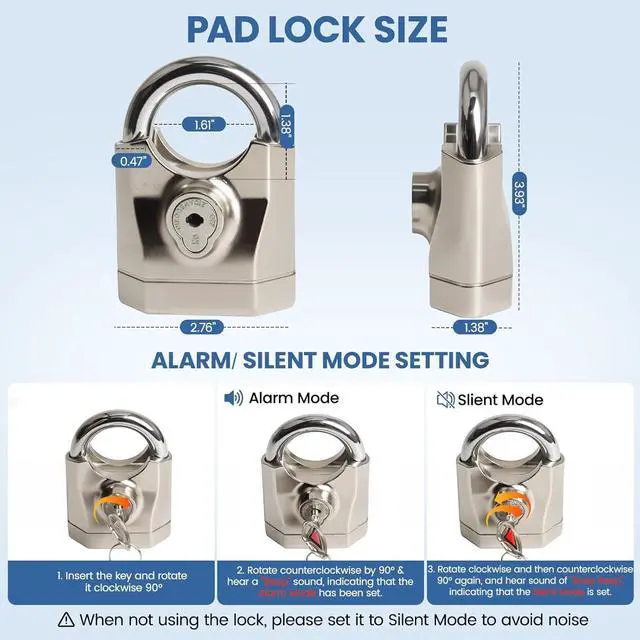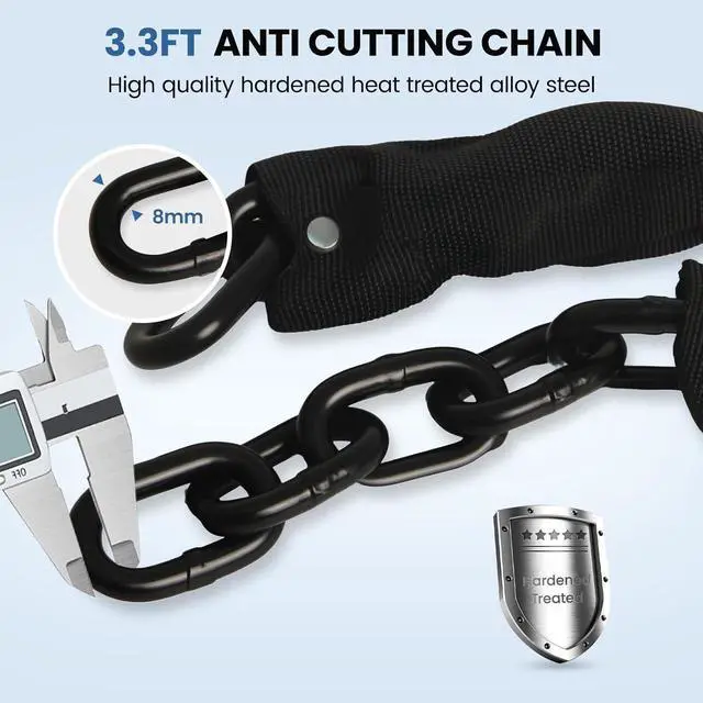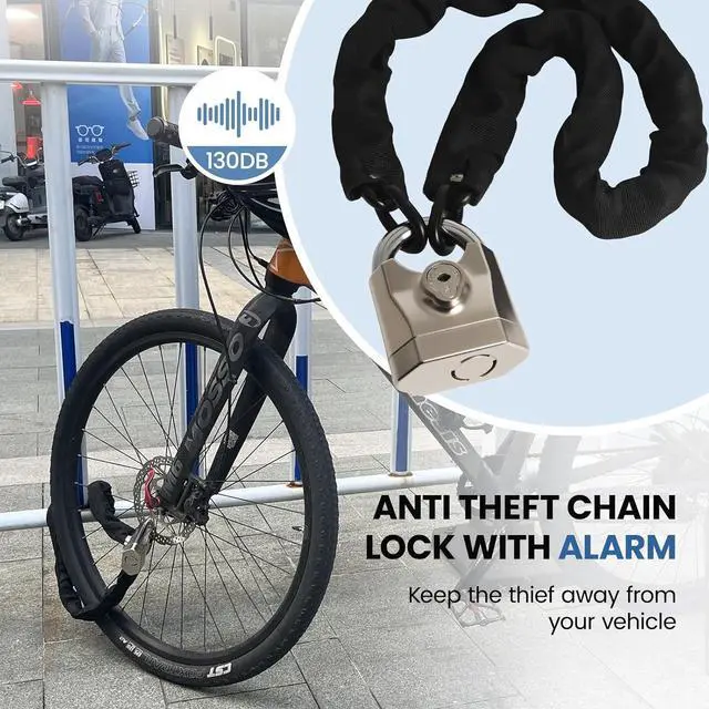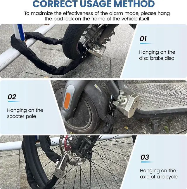 Perfect for anti-theft of bikes, ebike, motorcycles, scooters, etc. To maximize the alarm function, please lock the padlock on the frame of the vehicle itself, preferably on the wheel or hub frame. Even if the chain is cut, the padlock can still feel the vibration and continue to sound the alarm.