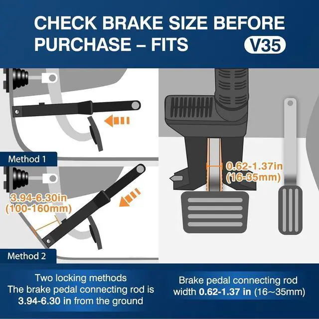 UNIVERSAL FIT MOST VEHICLES- This antitheft locking is suitable for brakes/clutches with height: 100~160mm(3 15/16-6 5/16" ) and width: 16~35mm( 5/8-1 3/8"). Our Car security anti theft easily locks under the brake pedal on most cars.