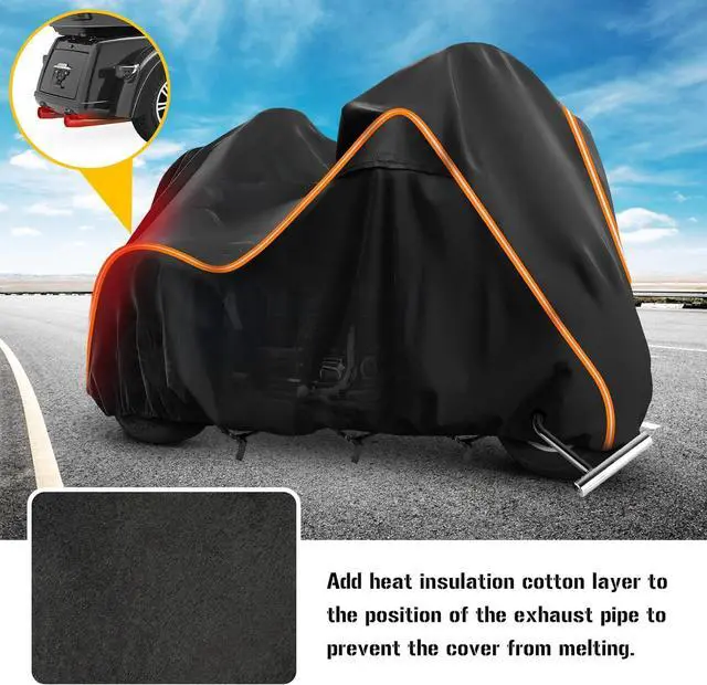 All-Weather ProtectionTheres anti-scalding cotton design to prevent the cover from melting. This motorcycle cover is made of premium Ox Fabric. Preserve your Vehicle and Paint Against All Rain, Pollen, Snow, Sun, Bird Droppings, Dust/Dirt - Approved for All Season Use. For a long-time use, it is best to put the cover back on after the engine has cooled.