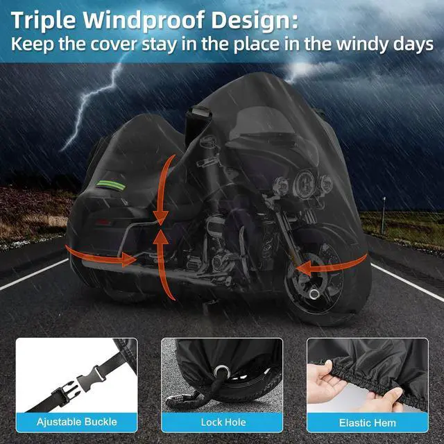 Windproof Design1. The adjustable windproof buckle at bottom ensure that your touring limited motorcycle cover won't be blown away in windy weather. 2. Elastic hems at the front and back secure the cover to the motorbike tightly and ensure a perfect custom fit. 3. The seams are all designed with ble-needle reinforced stitching for tear resistance and durability.