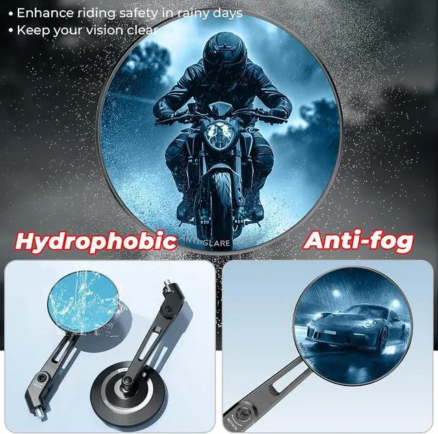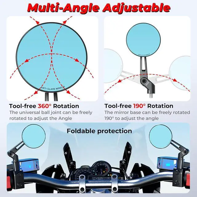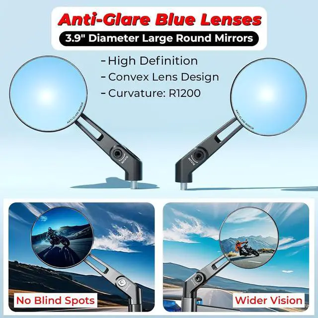 Anti-Glare Blue Lenses: The motorcycle rear view mirrors using high-definition optical glass lenses, night riding anti-distce far light, glare is not dazzling, long time to see without fainting, and s visual clarity for safer night riding
