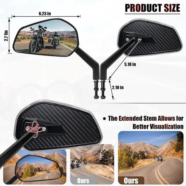 The motorcycle mirrors utilize a unique carbon fiber blend, Providing superior impact resistance and long-lasting performance The package includes all necessary hardware, Making the installation process quick and straightforward