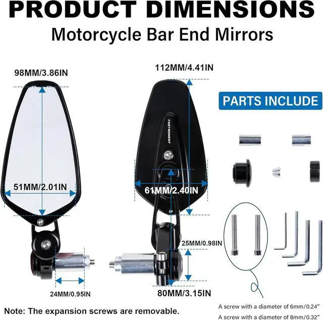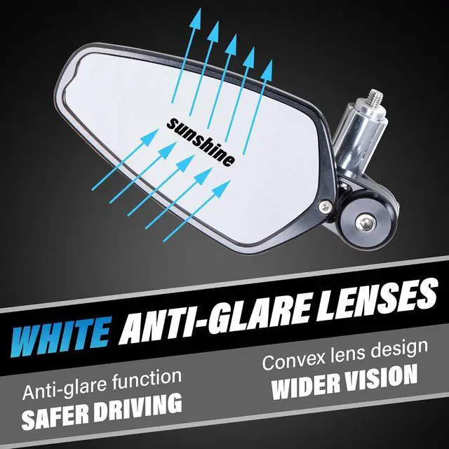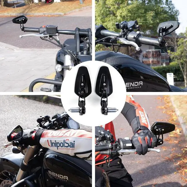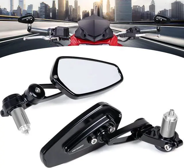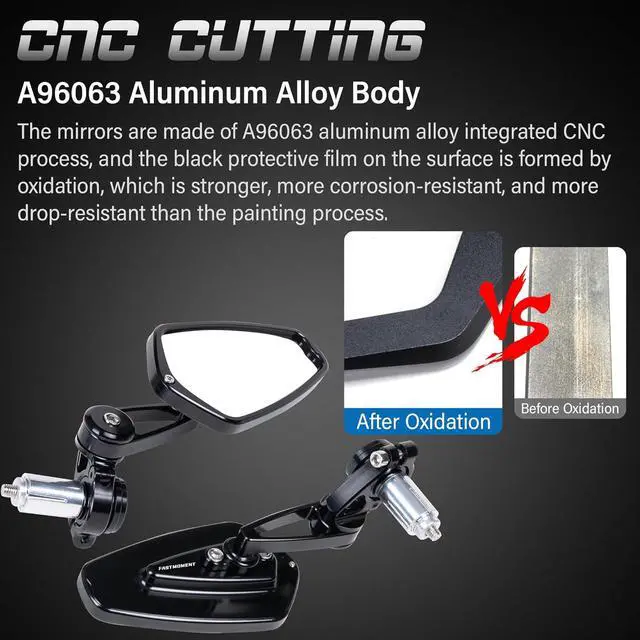 - motorcycle bar end mirrors combine styling and high quality. The motorcycle mirrors adopts A96063 aluminum alloy, screws on it are made of high quality 304 stainless steel, integrated CNC process, the black protective film on the surface is formed by oxidation, which is stronger and more corrosion resistant than the spray painting process, and the ball head part of the mirror is the car wheel hub process, which is plated with nickel and chromium, and is more resistant to falling.