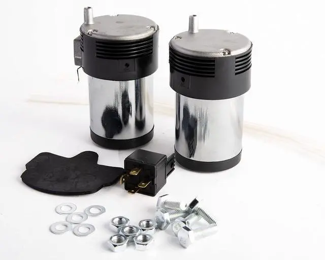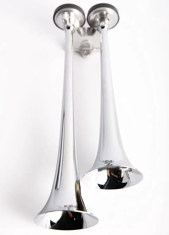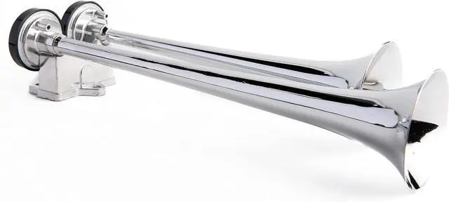 , 2-Trumpets Loud Sound at 129dB, Compact Air- Horn-Kit. Trumpets are chrome plated metal. Universal fit for Truck, Car, RV, SUV, Pick-Up, and Marine Boats. Comes with 2 Heavy-Duty Maintnce Free 12volt Air-Compressors, Mounting-Brackets, Hardware, Air Hoses, Relay, and installation instructions. Easily installs in any vehicle. Considering the condensed limited space under the hood in today's vehicles, this Air-Horn-kit is compact in size and does not require a lot of space. It will surely produce a much louder sound than the factory's wimpy horn.