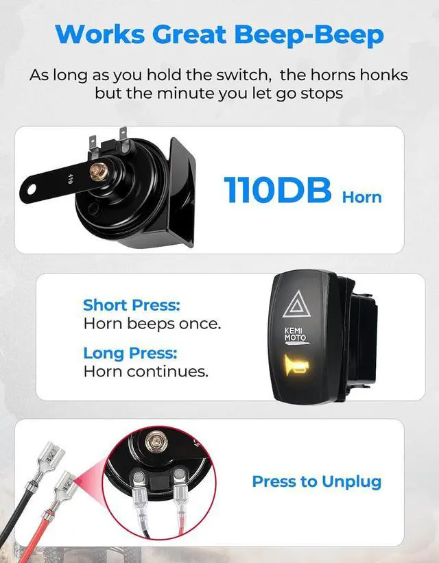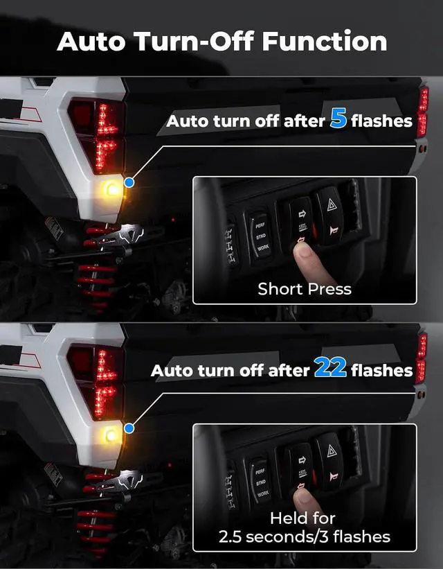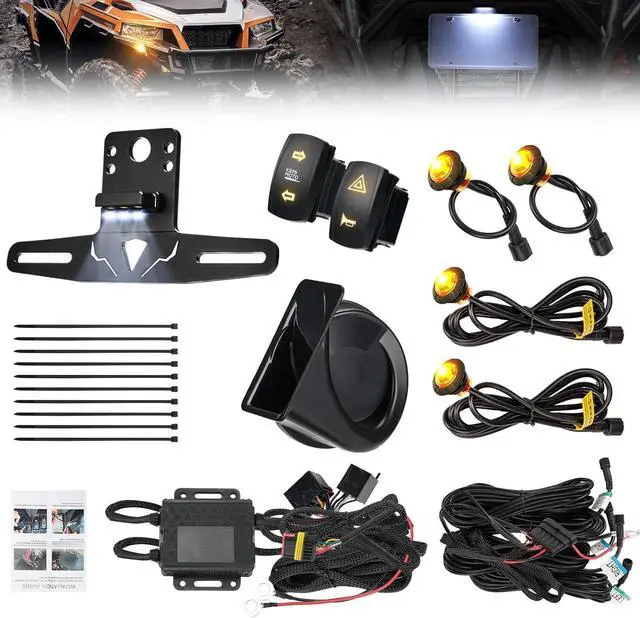 Package Includes: The turn signal kit features an upgraded wire harness (fits vehicles up to 220 inches) with color-coded markings for easy installation. The kit includes all necessary accessories, including amber turning signal lights x4, Aluminum License plate holder with light x1 (Excluding the license), 110db horn x1, left/right rocker switch x1, hazard, horn switch x1, harness set x1, relay x1, nylon cable ties set x1, and an installation guide x1