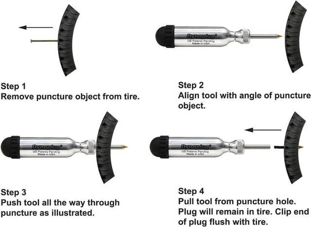 USE: A DIY tubeless tire puncture repair Tool. Load and insert one repair plug to seal a puncture about 3/16 inch in diameter. A second repair plug may be inserted as needed and depending on the condition of the tire. Used to repair tubeless tires on cars, motorcycles, tractors, bicycles, and more.