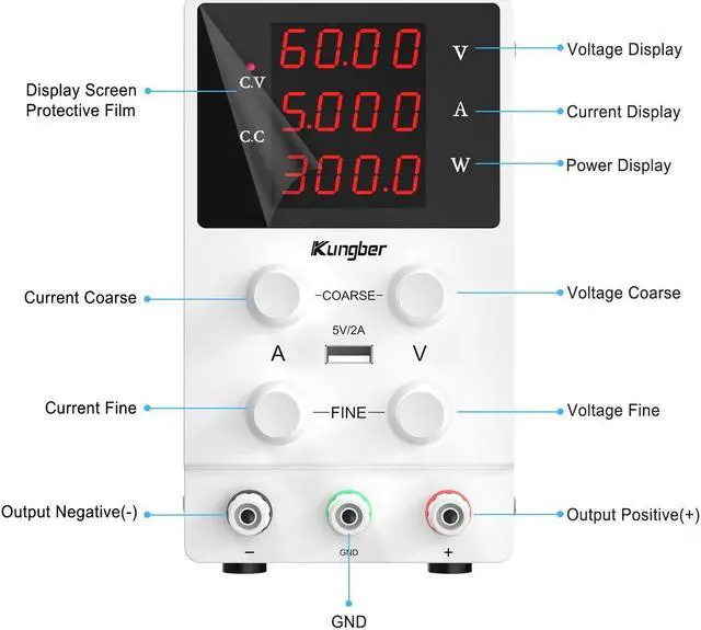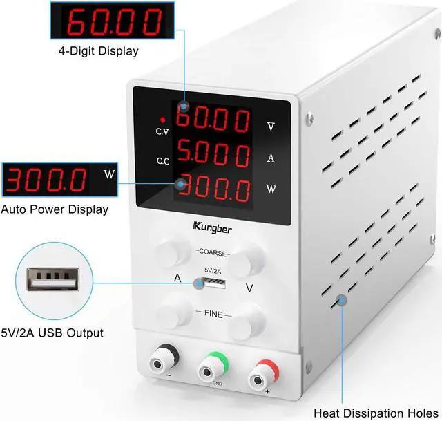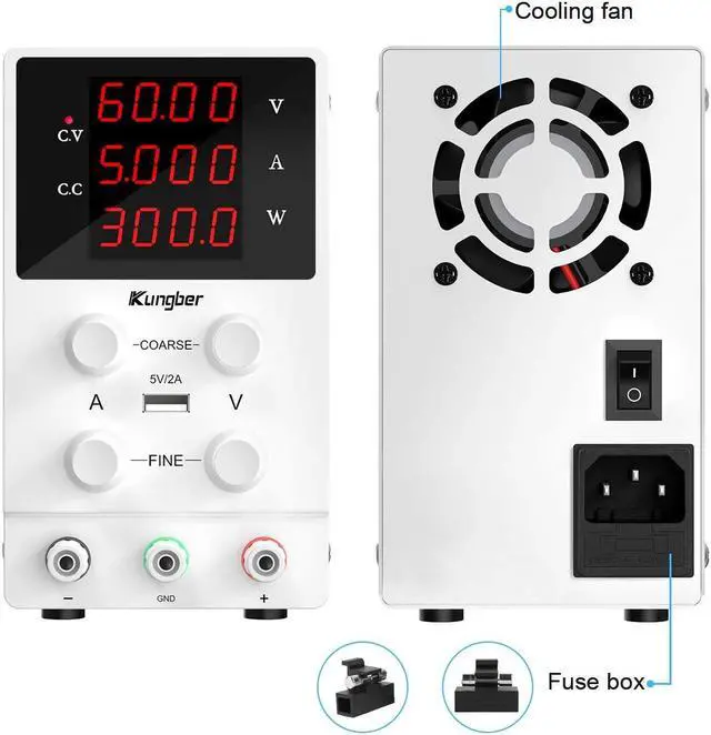Safety: Many safety measures are adopt in Kungber DC bench power supply- Grounding wire, Leakage protection, Thermal protection, Voltage overload, Power overload and Short-circuit protection. Kungber power supply use premium electronic components, provide reliable working status and prolong the life of product effectively. When the working temperature is more than 122/50, the intelligent thermal protection will active the cooling fan to lower the temperature according to the load.