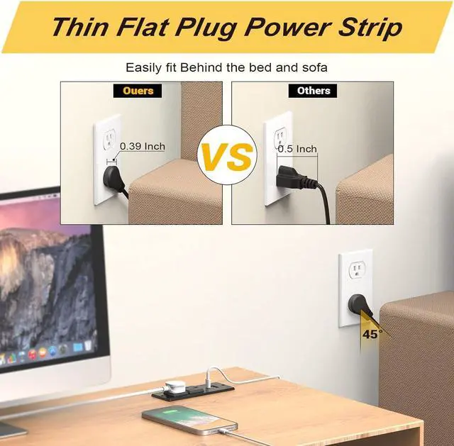 Recessed USB Outlet with extra thin flat plug . 0.39-inch ultra thin plug, Maximize space savings in your plug.125V/15A/1875W output. Multi-plug outlet extender with 6.56ft cord.