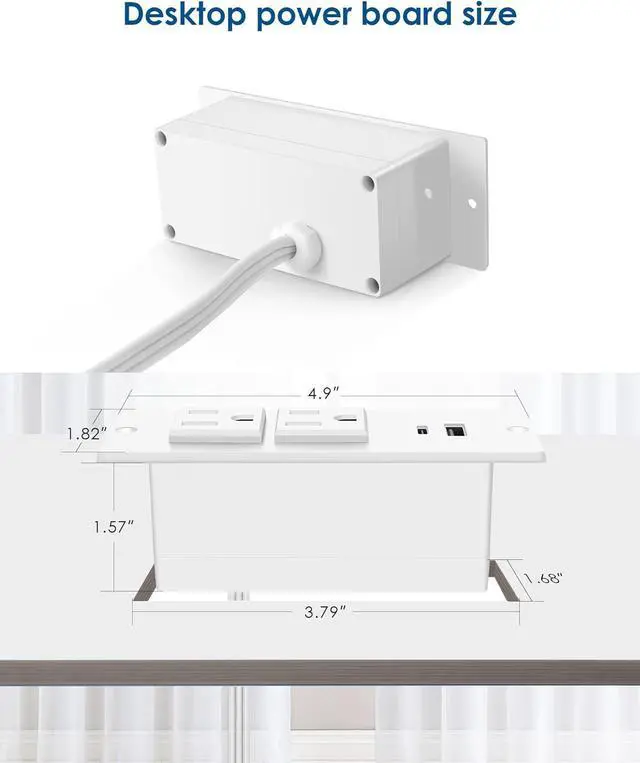This Table Power Outlet is Easy to Assemble:According to the size of the picture,cut a rectangle in table, place the recessed outlet in then screw it tight.Hole cut size: L 3.79" * W 1.68" * H 1.57".