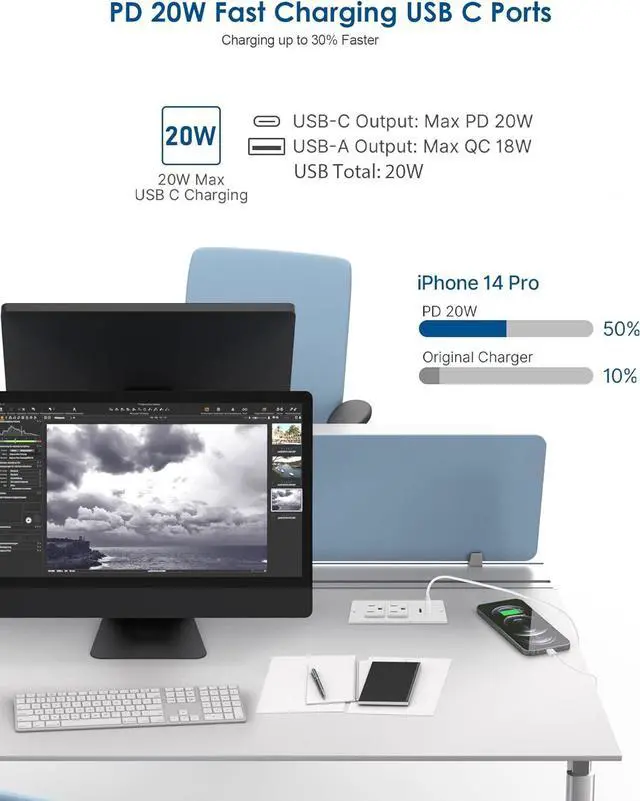 Conference recessed power strip with 1 USB-Type C,1 USB-Type A.PD 20W USB-C Output:5V/3A, 9V/2.22A, 12V/1.66A.USB-A Output: 5V/2A in total.